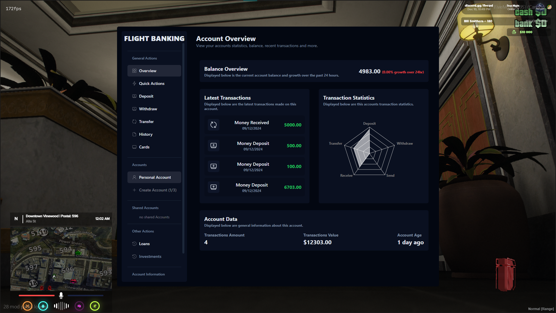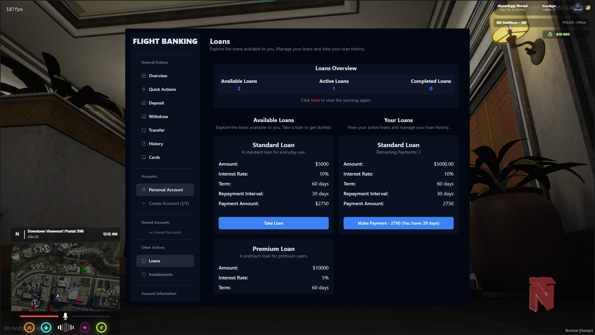 - Added Banking 2.0 - Item-based credit and debit cards for immersive roleplay, shared and personal savings accounts with daily interest, detailed transaction history tracking, customizable VIP system to limit accounts and perks, loans and investments with periodic gains and repayment options, endless creation of loan and investment plans.